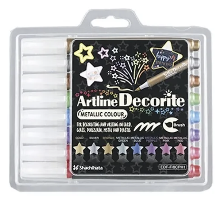 Marcadores Artline Decorite metálicos en 8 colores, ideales para escribir y decorar sobre cartulina, vidrio, porcelana, metal y plástico. Su tinta de alta densidad ofrece un acabado vibrante incluso en papeles oscuros y permite aplicar capas una vez seca. Funcionan en prácticamente cualquier superficie y son perfectos para proyectos creativos en múltiples materiales. En superficies no porosas, como plástico o vidrio, pueden borrarse en húmedo de forma sencilla y repetida.